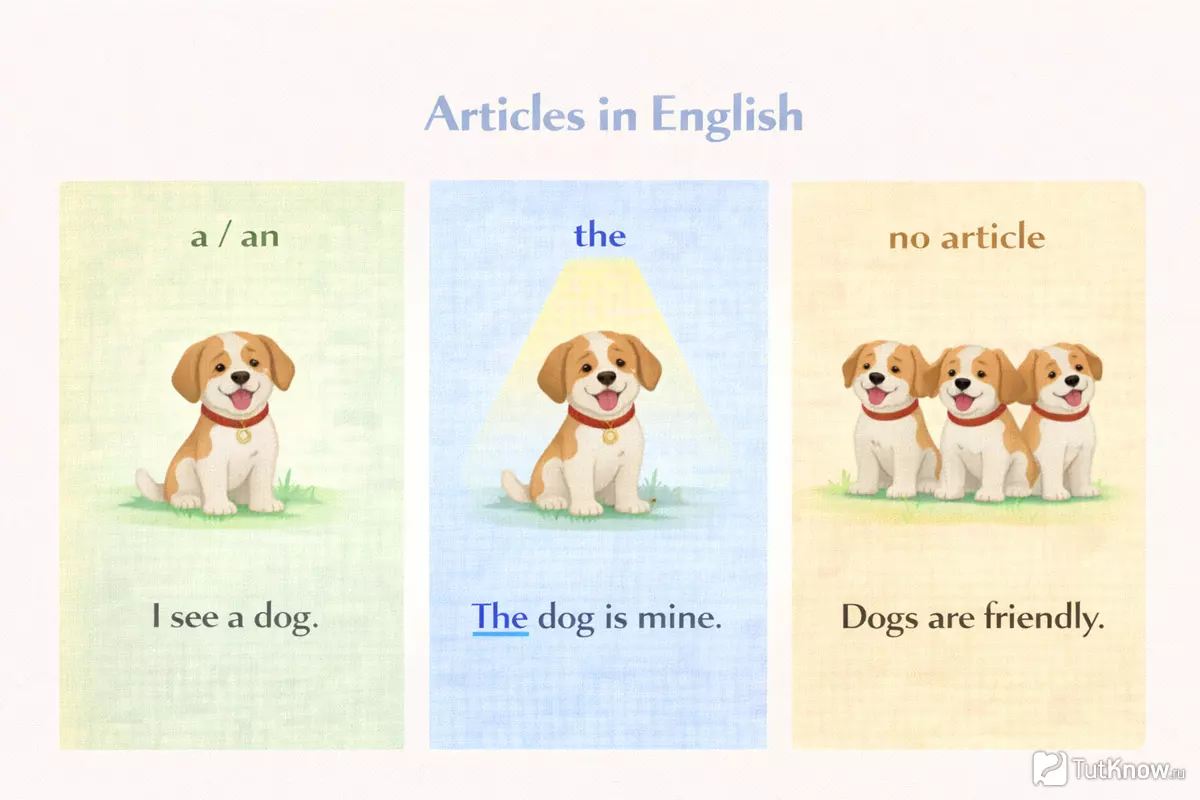 | Неопределённый артикль (a/an) | Один из многих, впервые упоминается | I saw a dog. (Я видел собаку.) | Любая собака, неизвестная ранее |