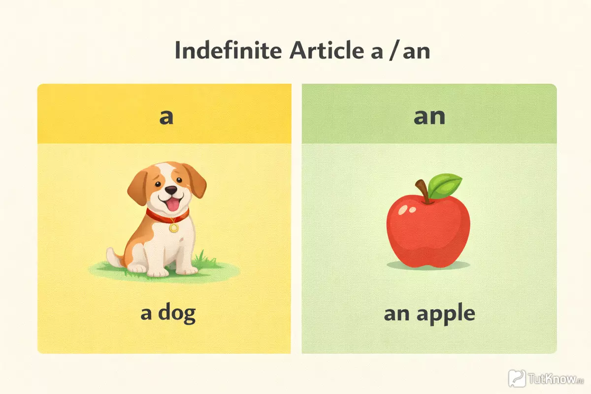 Артикли a и an применяются перед существительными в единственном числе, если речь идёт о чём-то неопределённом или упоминается предмет впервые. Форма a используется перед словами, начинающимися с согласного звука, а an — перед гласным звуком. Например: «a cat», «an apple».