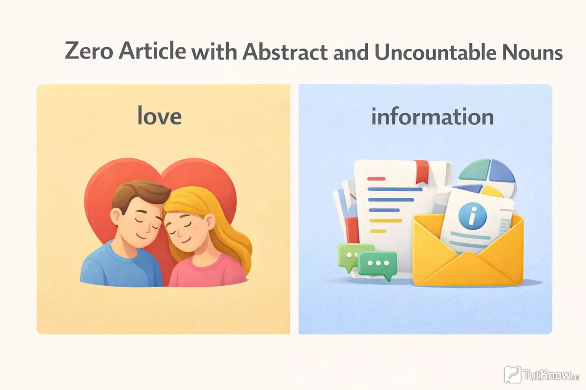 Абстрактные существительные обозначают идеи, чувства, состояния или качества, которые нельзя потрогать или посчитать. Например, «love» как чувство, «freedom» как идея, «advice» как нечто нематериальное. В таких случаях артикль обычно не ставится: «Love is important», «Advice can be helpful».