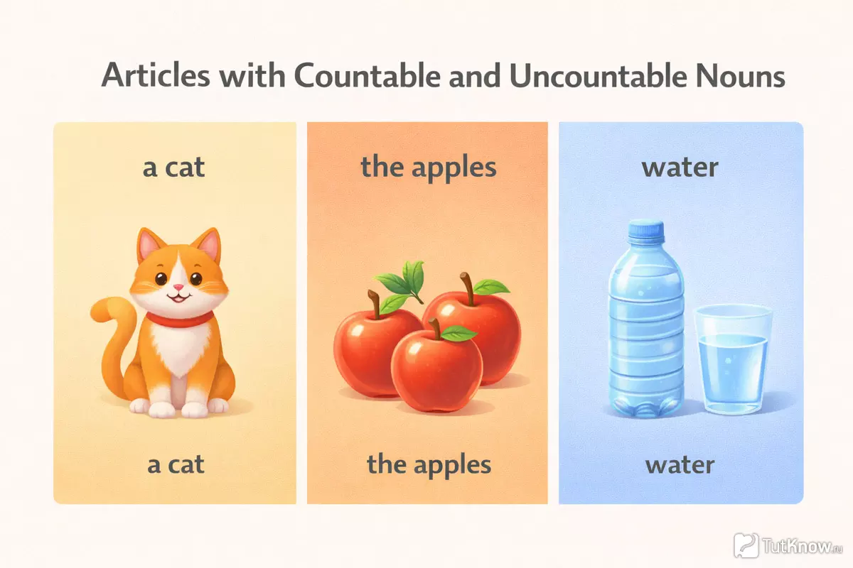 | Артикли | Можно использовать a/an (a cat, an apple) | Обычно без a/an, но возможен the или zero article (the water, ∅ milk) |