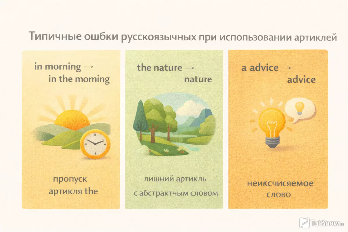 Чтобы избежать подобных ошибок, полезно запомнить основные группы слов и выражений, которые не требуют артикля. Не стоит автоматически добавлять a или the там, где в русском языке ничего не стоит — лучше проверить правило или примеры.