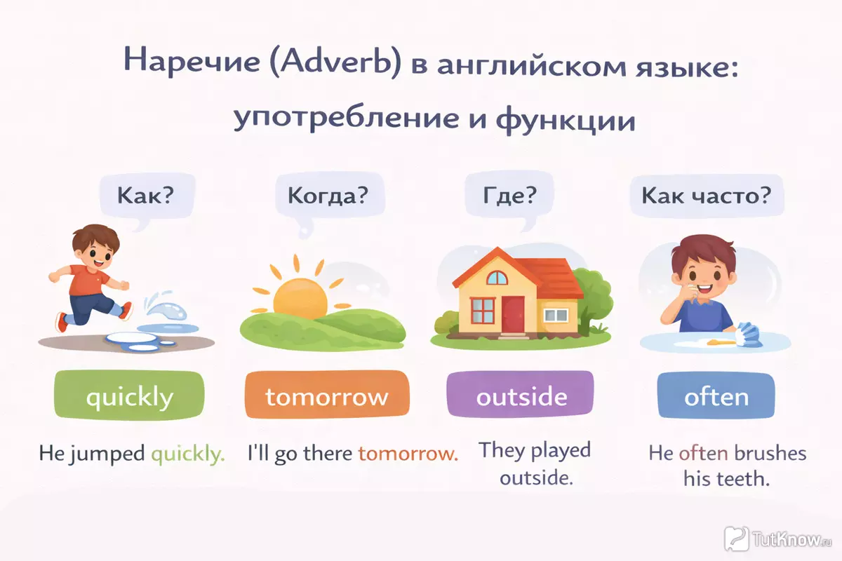 - Уточнение действия (глагола): «He runs quickly».