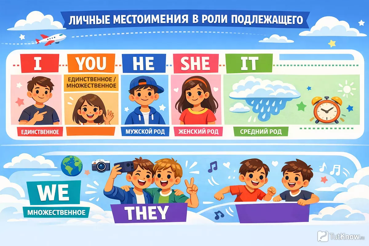В английском языке такие слова, как «I», «you», «he», «she», «it», «we», «they» используются для указания, кто выполняет действие в предложении. Подобные формы обязательно ставятся перед глаголом и не опускаются, в отличие от русского, где сказуемое часто понятно из контекста. Например, в фразе «She likes coffee» слово «she» указывает, кто именно предпочитает кофе.