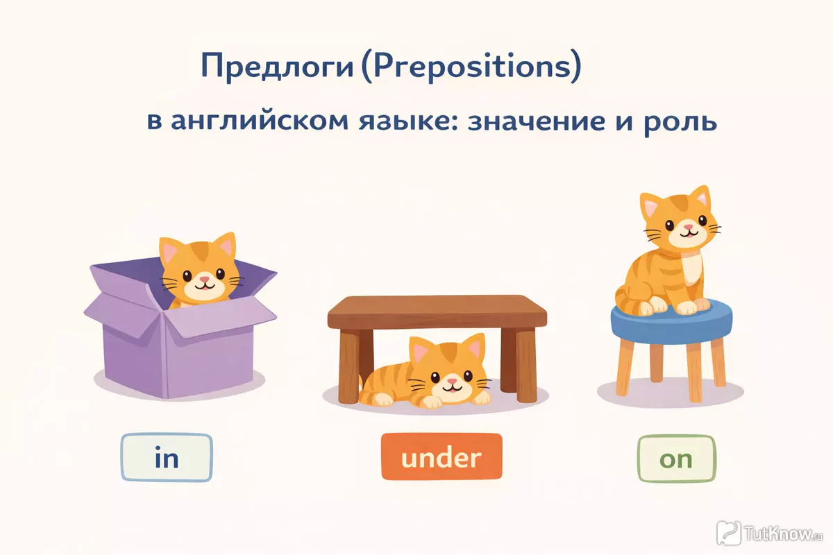 | Место | in, on, at, under, between, above, behind | The cat is under the table. (Кошка находится под столом.) |