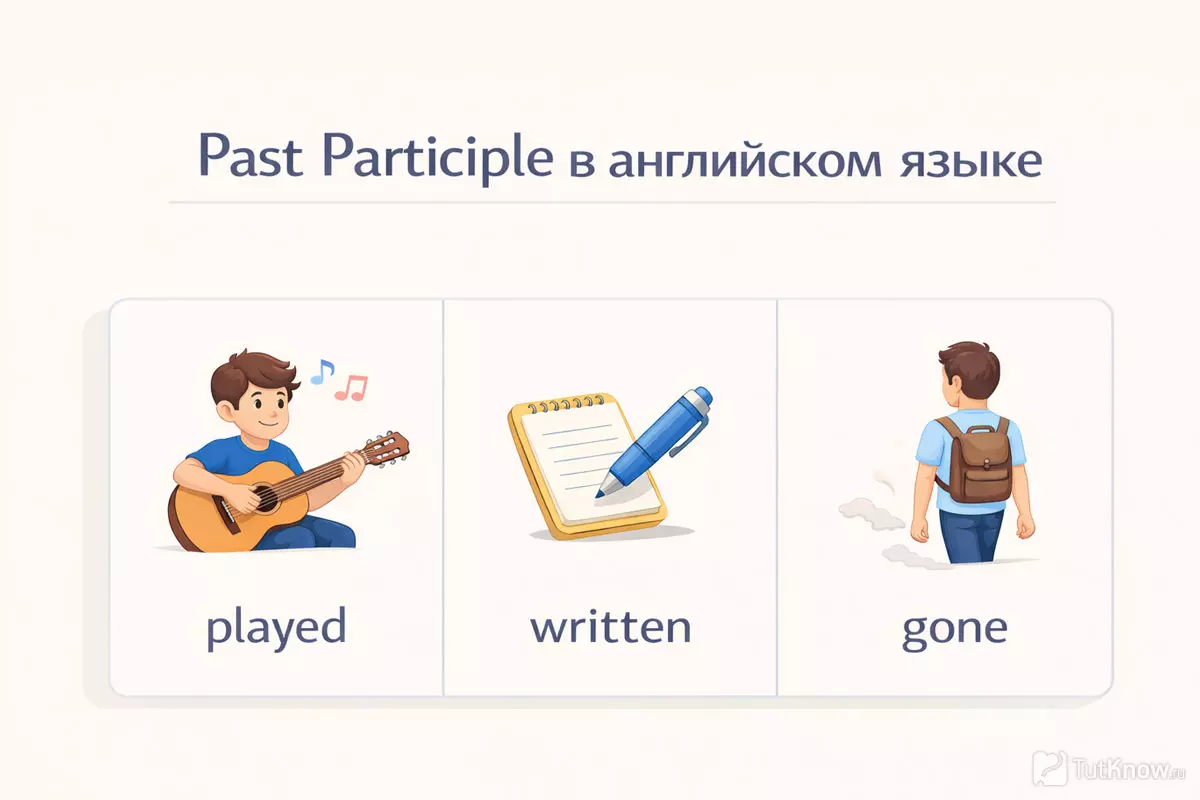 - Past Participle — для формирования времен группы Perfect («I have visited Paris»), в пассиве («The letter was written»), а также в роли определения («the broken window»).