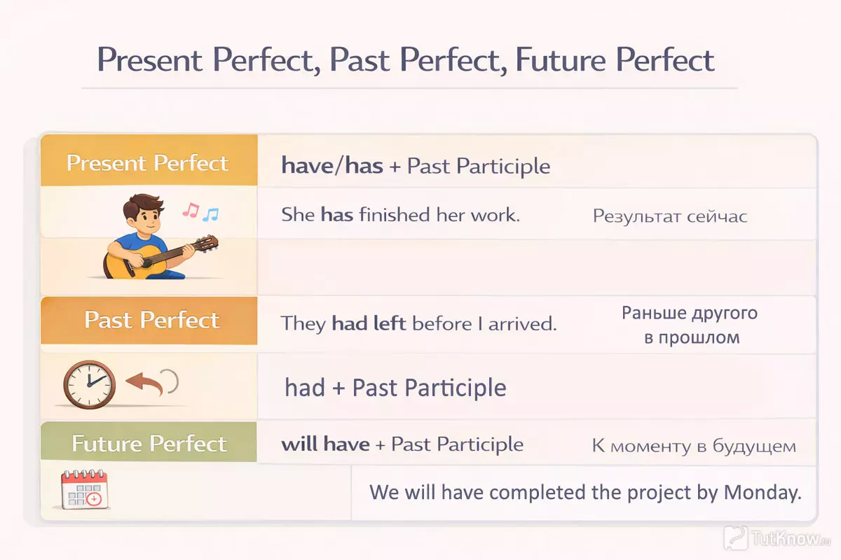 Для образования времен группы Perfect (Present Perfect, Past Perfect, Future Perfect) всегда нужен вспомогательный глагол have/has/had и третья форма смыслового глагола. Именно она указывает на завершённость действия к определённому моменту.