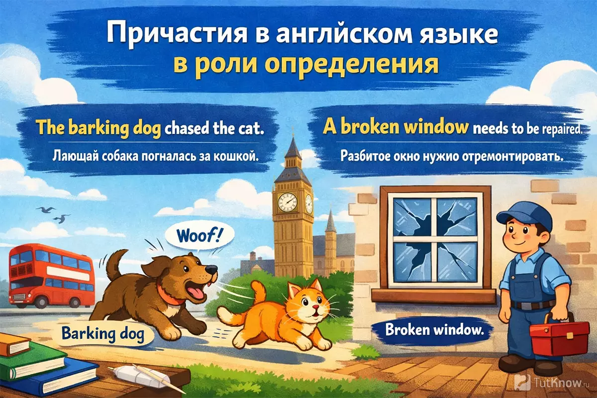 В английских предложениях причастия, выполняющие функцию определения, могут располагаться как непосредственно перед существительным, так и после него. Выбор места зависит от типа причастия, его длины и контекста. Краткие формы, особенно одиночные причастия, обычно ставятся перед определяемым словом: «the broken window» («разбитое окно»), «a running man» («бегущий человек»). Если же оборот более длинный или требует пояснения, он переносится после существительного: «the man sitting by the window» («мужчина, сидящий у окна»).