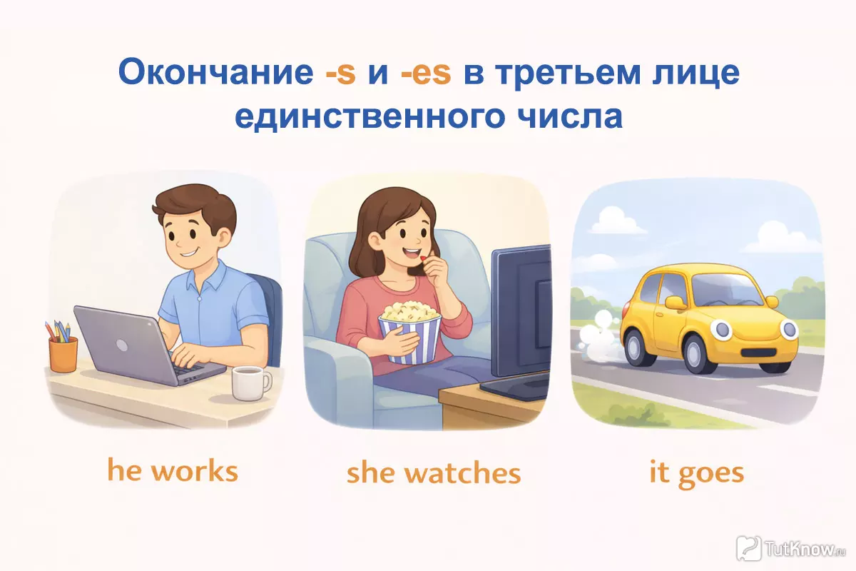 В английском языке к глаголам в настоящем времени добавляют -s или -es, если речь идёт о действии, совершаемом в третьем лице единственного числа (he, she, it). Это правило касается только утвердительных предложений. Выбор между -s и -es зависит от того, на какую букву или сочетание букв оканчивается основной глагол.