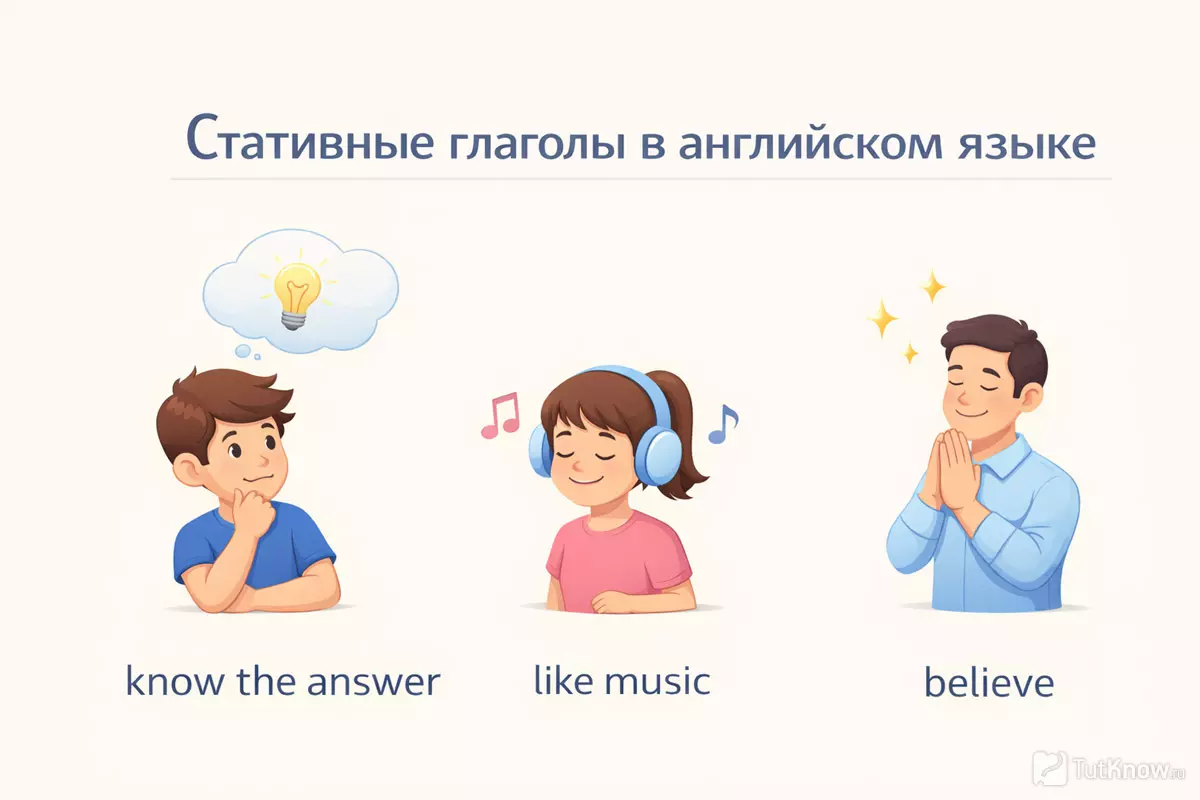 | Стативные | know, believe, love, own, understand, belong | Редко (обычно некорректно) | Состояние, чувство, обладание, восприятие |