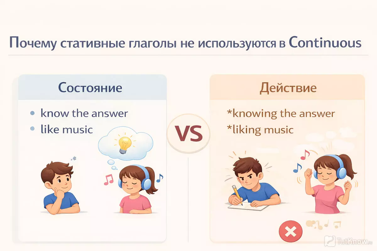 Continuous нужен, чтобы подчеркнуть временность и протекание действий. Но если речь идёт о мыслях, желаниях, принадлежности, восприятии или чувствах, то здесь нет активного процесса. Именно поэтому фразы вроде «I am knowing» или «She is liking» звучат некорректно — они нарушают саму логику английской грамматики.