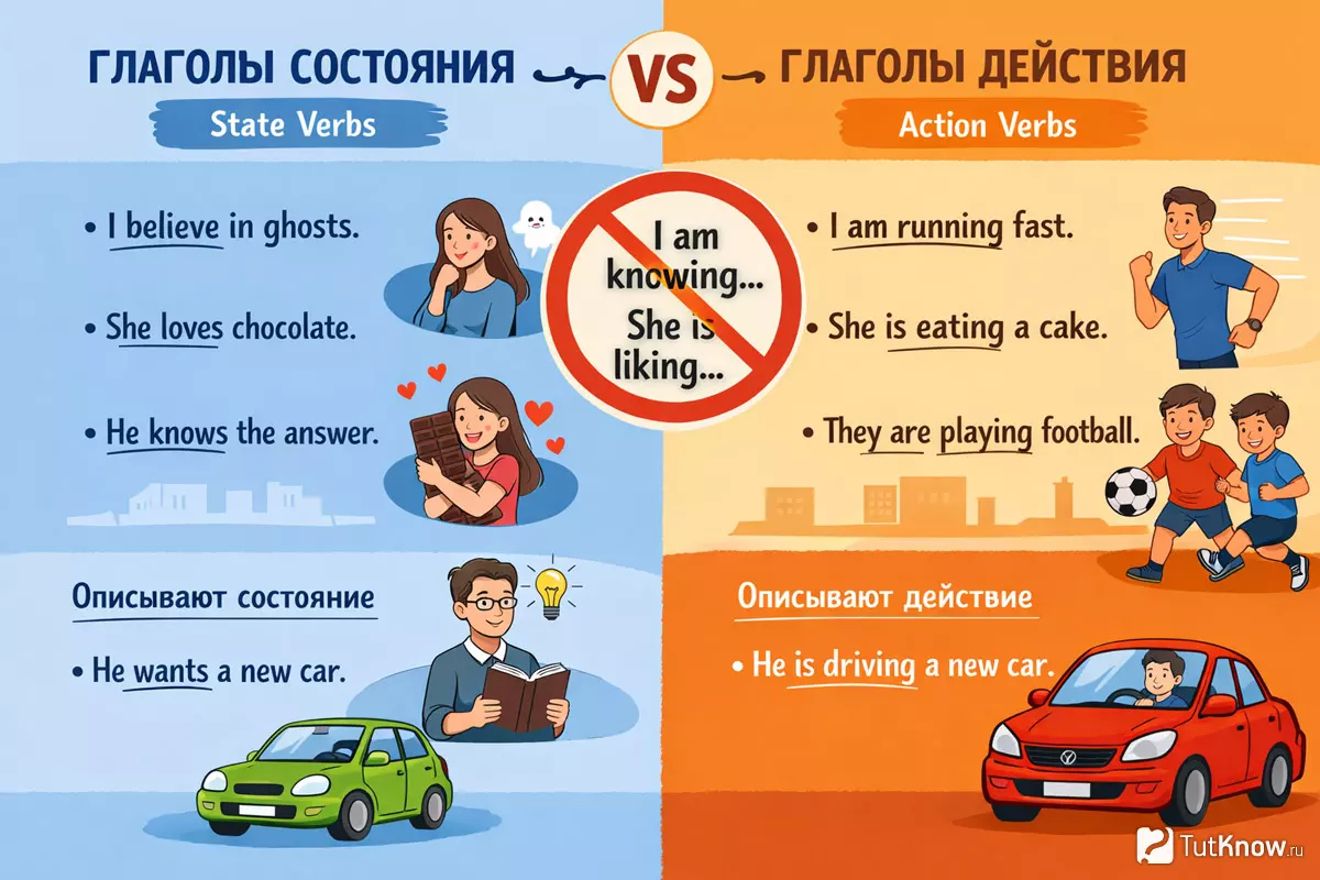 Глаголы, описывающие действия, обычно передают процесс или изменение: что-то происходит, кто-то что-то делает. В то время как слова, обозначающие состояния, отражают неизменные, стабильные положения вещей, чувства, мысли или характеристики. Например, «run» (бежать) — процесс, а «know» (знать) — это знание, не требующее действия.