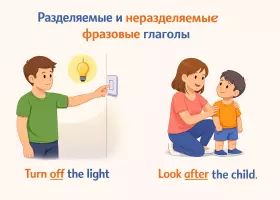 | Неразделяемые | Частицы всегда идут после глагола, нельзя вставлять слова между ними | look after children (нельзя: look children after) |