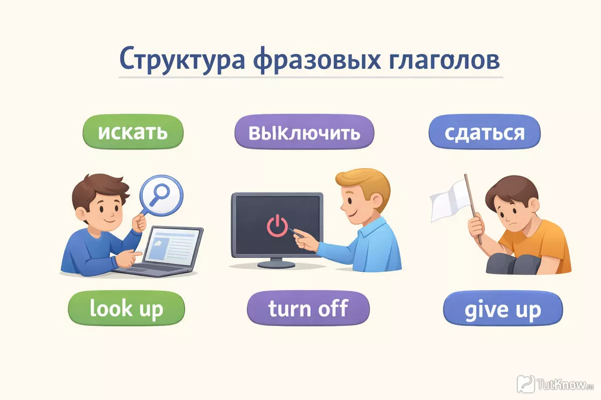 Чтобы не путаться с английскими фразовыми глаголами, важно научиться отличать их составные части. Обычно такие выражения состоят из глагола и одной или двух служебных частиц — предлогов или наречий. Частицы могут менять значение глагола до неузнаваемости, поэтому просто переводить слова по отдельности не получится.