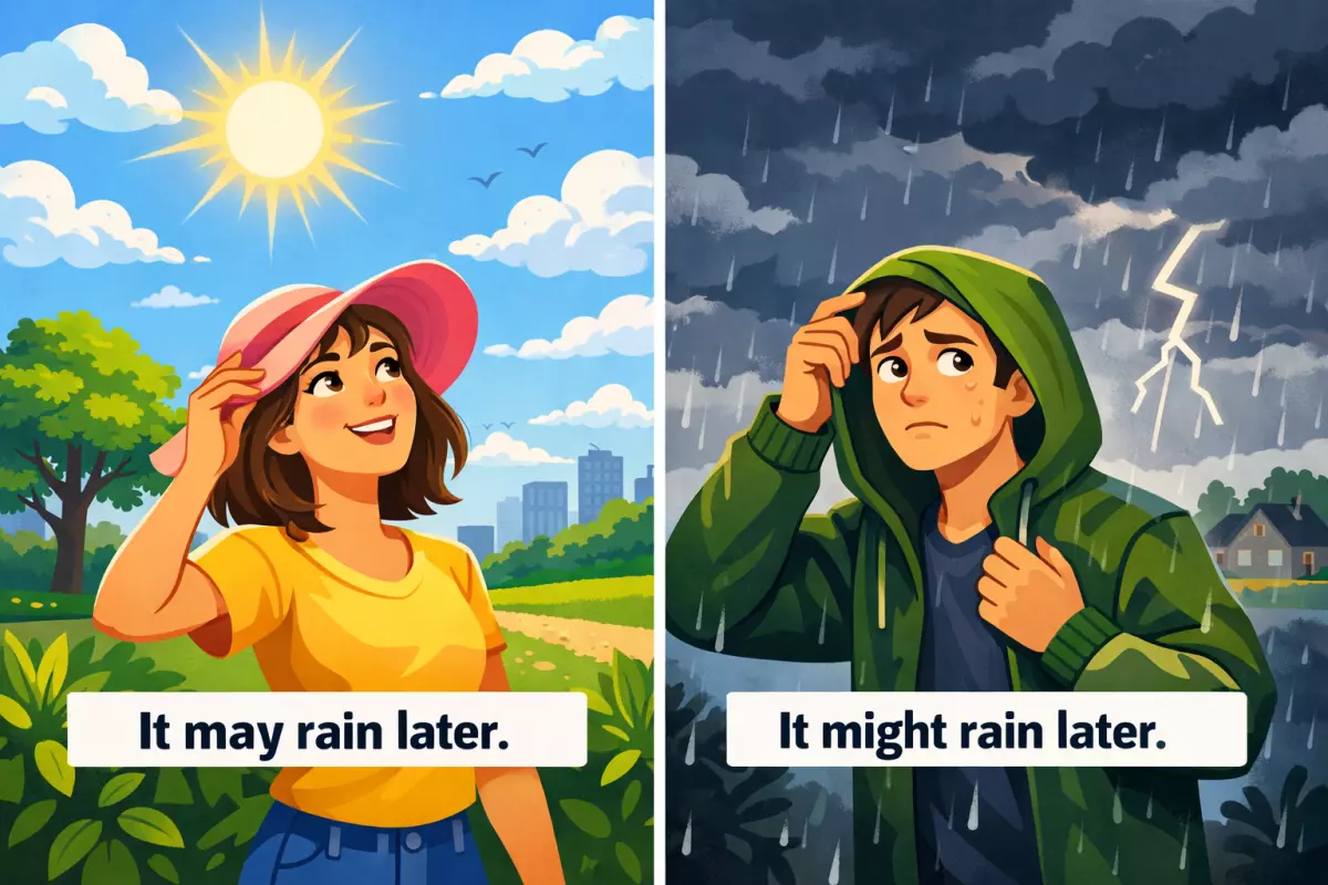 May обычно звучит увереннее: говорящий видит реальный шанс, опирается на факты или ситуацию «прямо сейчас». Might мягче и осторожнее: это предположение с большей долей сомнений, когда данных мало или вариантов много.