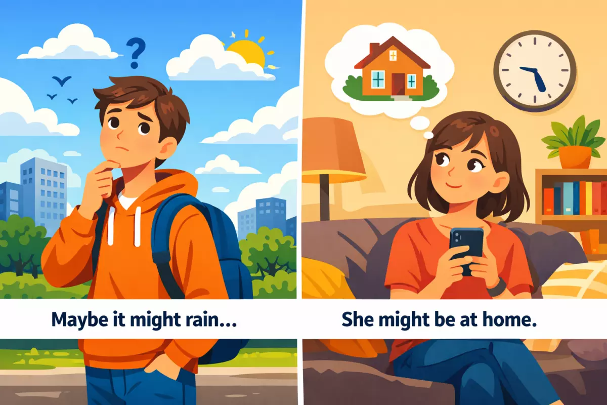 Важно: «might» не сообщает точный процент вероятности, он просто снижает категоричность. Точный смысл считывается по ситуации, интонации и дополнительным словам вроде «probably», «maybe», «I’m not sure».