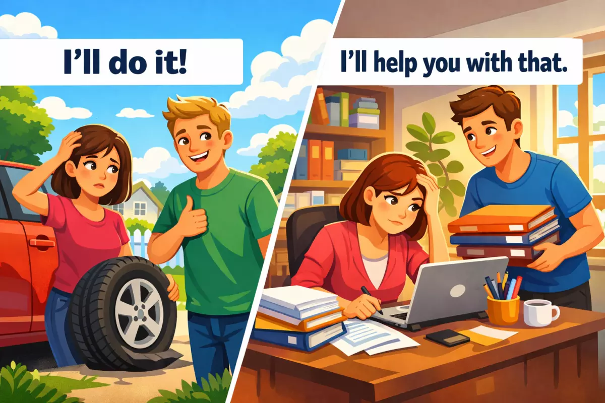 | Просьба о помощи | «I’ll help you with that.» | «Я помогу (прямо сейчас/без подготовки)» | Реакция на просьбу, а не заранее согласованный план. |