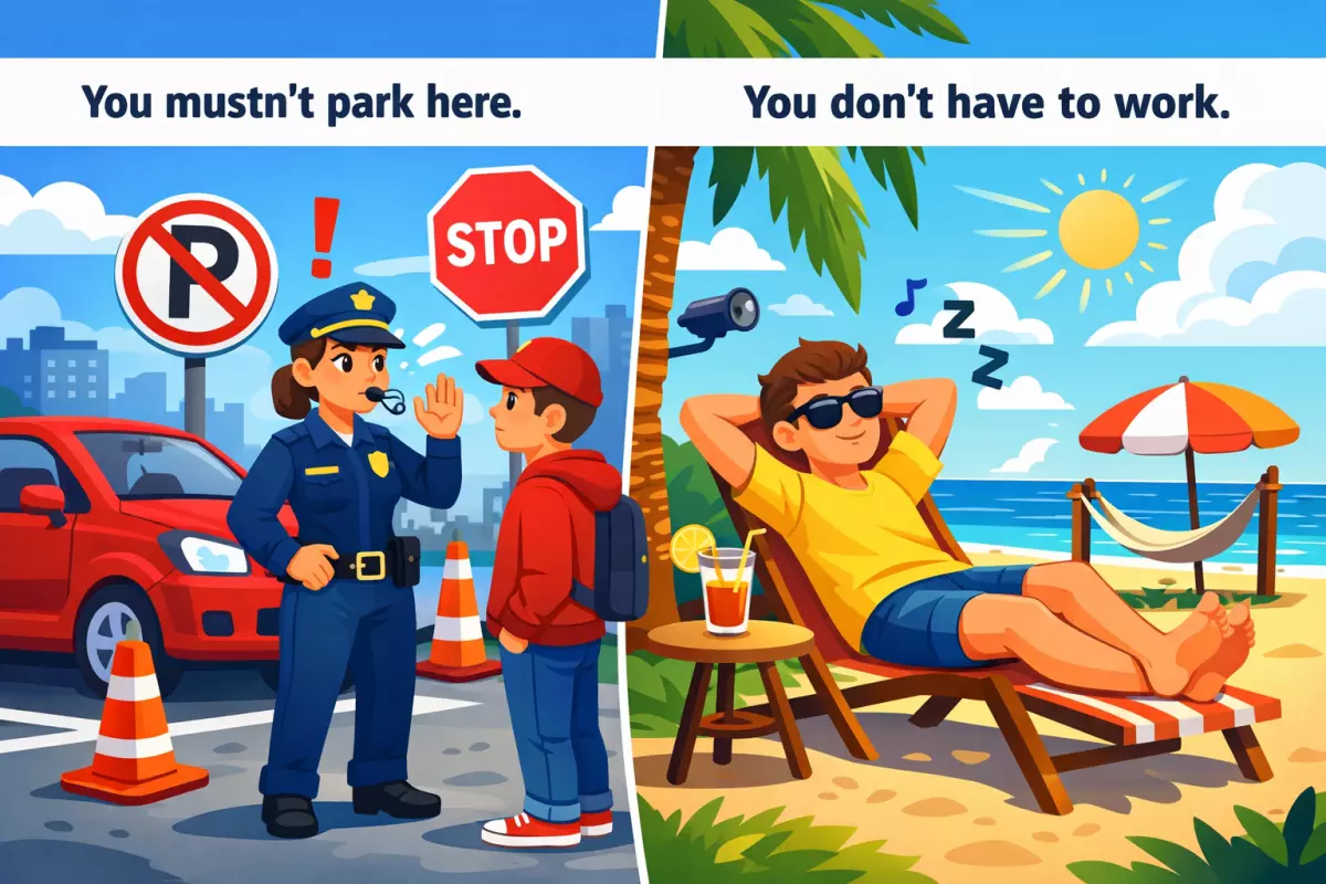 - Путаница «mustn’t» и «don’t have to»: «mustn’t» = «нельзя», а «don’t have to» = «не нужно/не обязан».