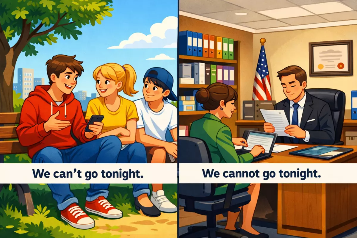 | Юридические формулировки, договоры | Полные формы | Точность и единый «сухой» стиль | «The tenant can’t sublet.» | «The tenant cannot sublet.» |