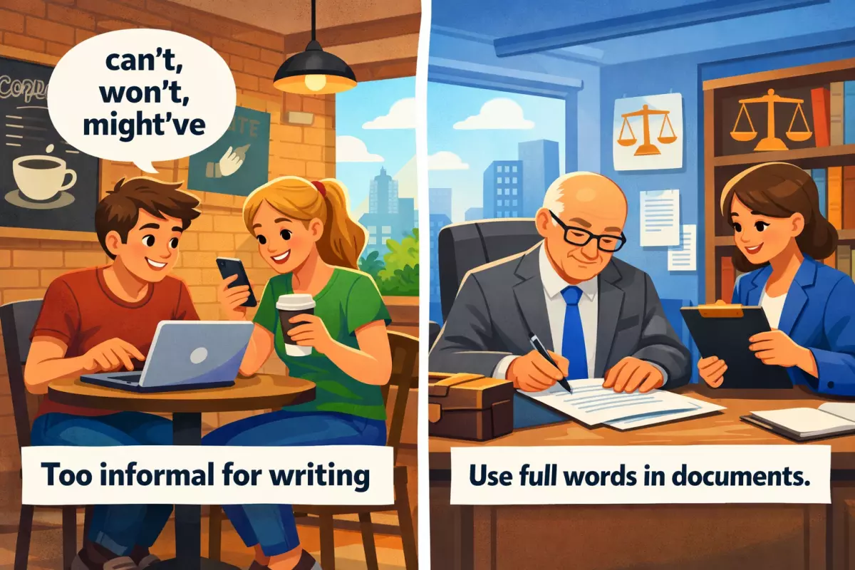 В тексте на английском краткие формы вроде «can’t», «won’t», «shouldn’t» и «might’ve» выглядят естественно не всегда. Есть ситуации, где они воспринимаются как слишком разговорные или даже двусмысленные — и тогда лучше писать полные варианты.