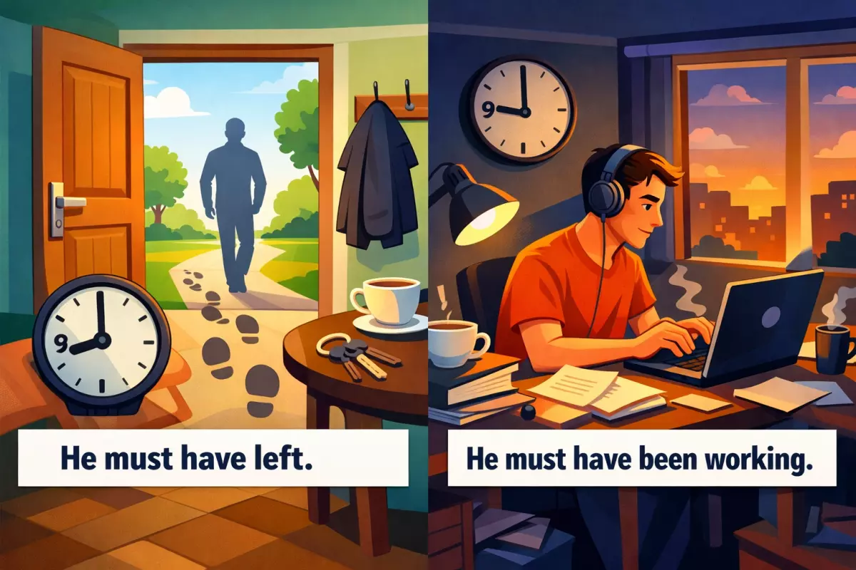 | Он ушёл рано | He left early. | He must have left early. | Во втором варианте «я не видел», но логика/улики подсказывают |