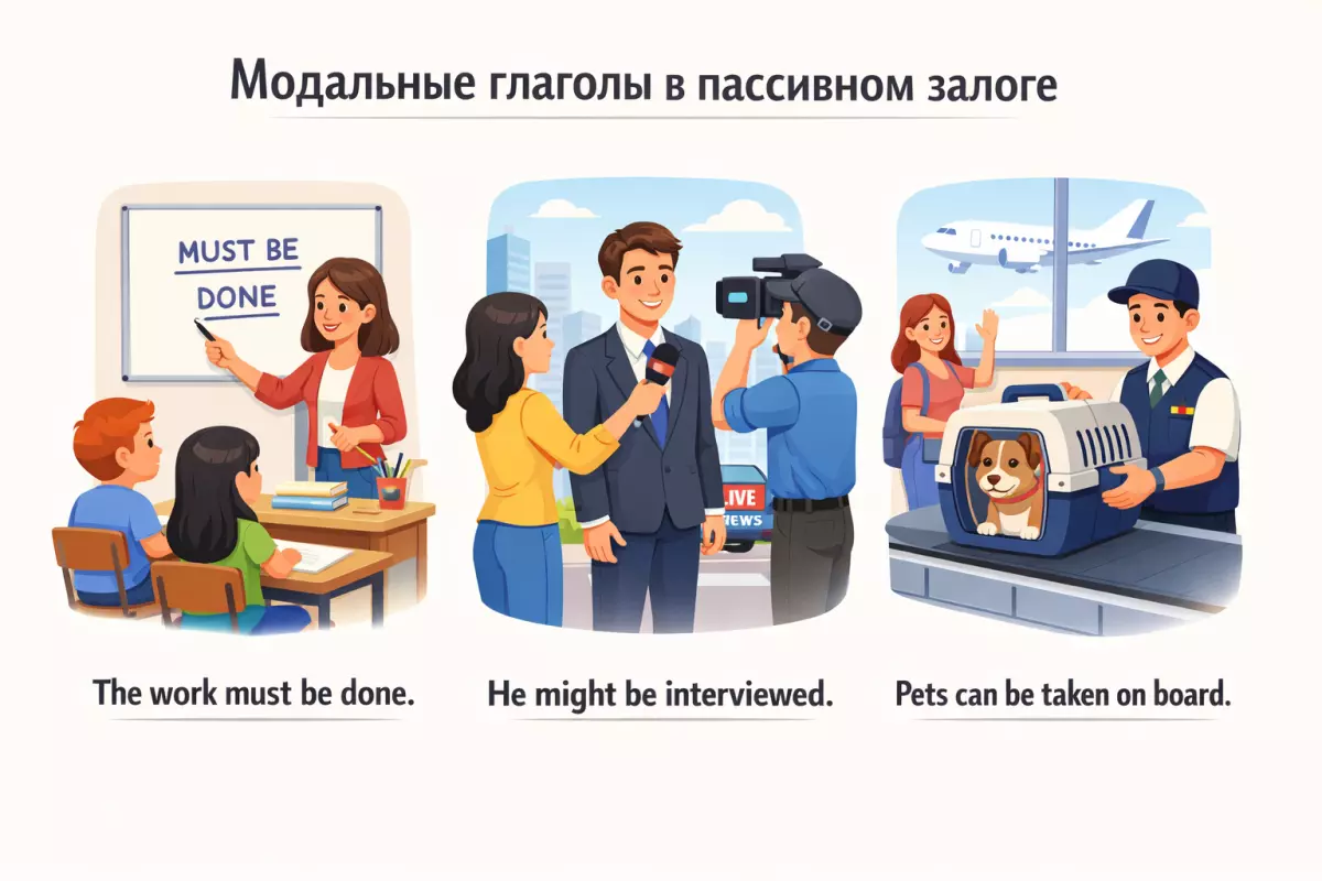 Схема довольно механическая: модальный глагол остаётся на своём месте, а дальше ставится be в нужной форме и Past Participle (V3). В итоге фокус смещается с того, кто делает действие, на объект действия.