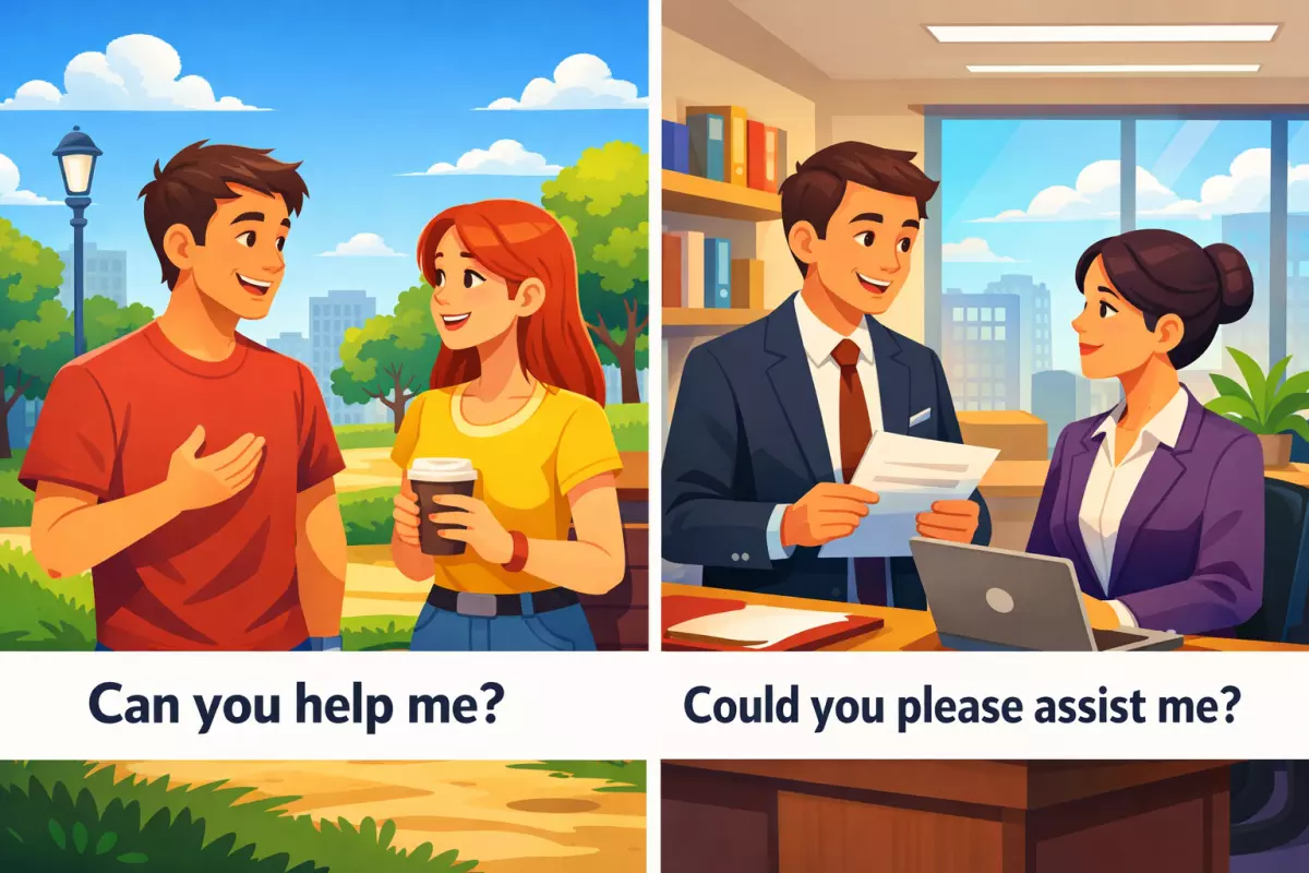 - «Вес» просьбы: чем больше неудобств для другого, тем мягче формулировка (переход от can к could/would и добавление вежливых маркеров).