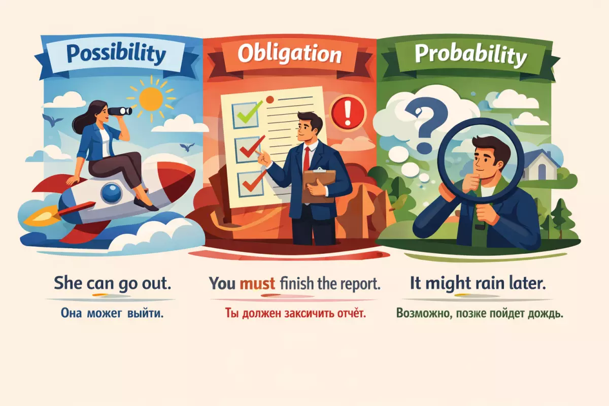 Большинство трудностей возникает не из-за формы, а из-за смысла. Один модальный глагол может быть связан с возможностью, другой — с необходимостью, третий — с предположением. Если не различать эти группы, фразы получаются неточными: там, где нужен мягкий вариант, появляется приказ, а там, где нужна уверенность, звучит сомнение.