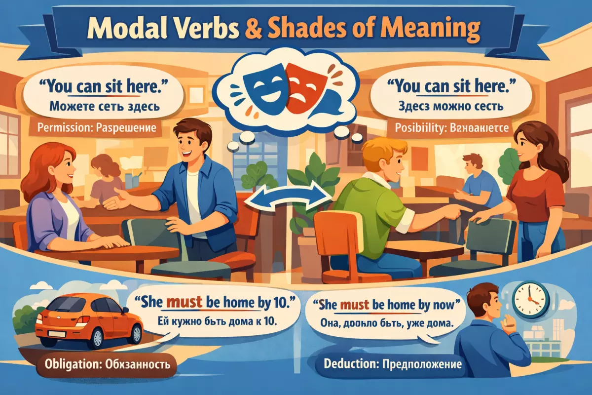 Поэтому нельзя учить модальные глаголы как набор фиксированных переводов. Гораздо полезнее замечать, что именно делает говорящий: разрешает, предполагает, требует, советует или смягчает фразу.