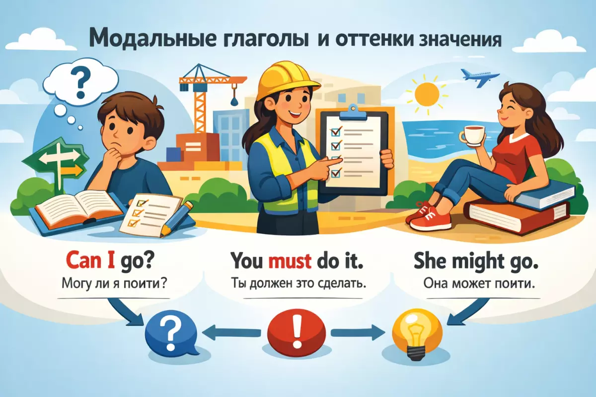 Сравните: You can leave now — «ты можешь уйти сейчас», You must leave now — «ты должен уйти сейчас», You might leave now — «возможно, ты сейчас уйдёшь». Само действие leave не меняется, но смысл высказывания становится совершенно другим. В этом и состоит главная роль модальных глаголов: они добавляют оттенок, без которого фраза часто теряет точность.