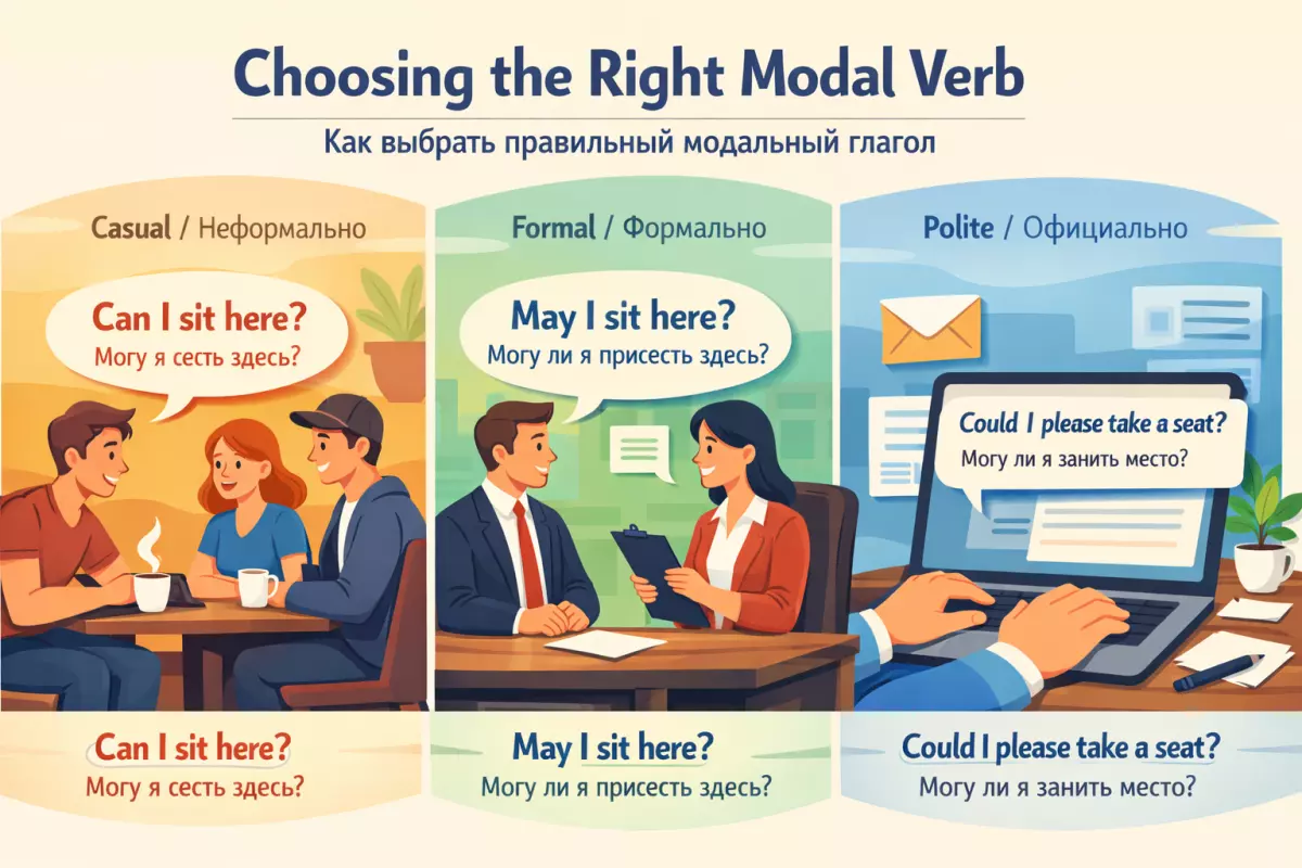 Главная трудность в том, что модальный глагол почти никогда нельзя выбирать изолированно. Нужно смотреть на три вещи: что именно хочет передать говорящий, в какой обстановке это говорится и насколько категорично или вежливо должна звучать фраза. Без этого даже грамматически правильное предложение может оказаться неестественным.