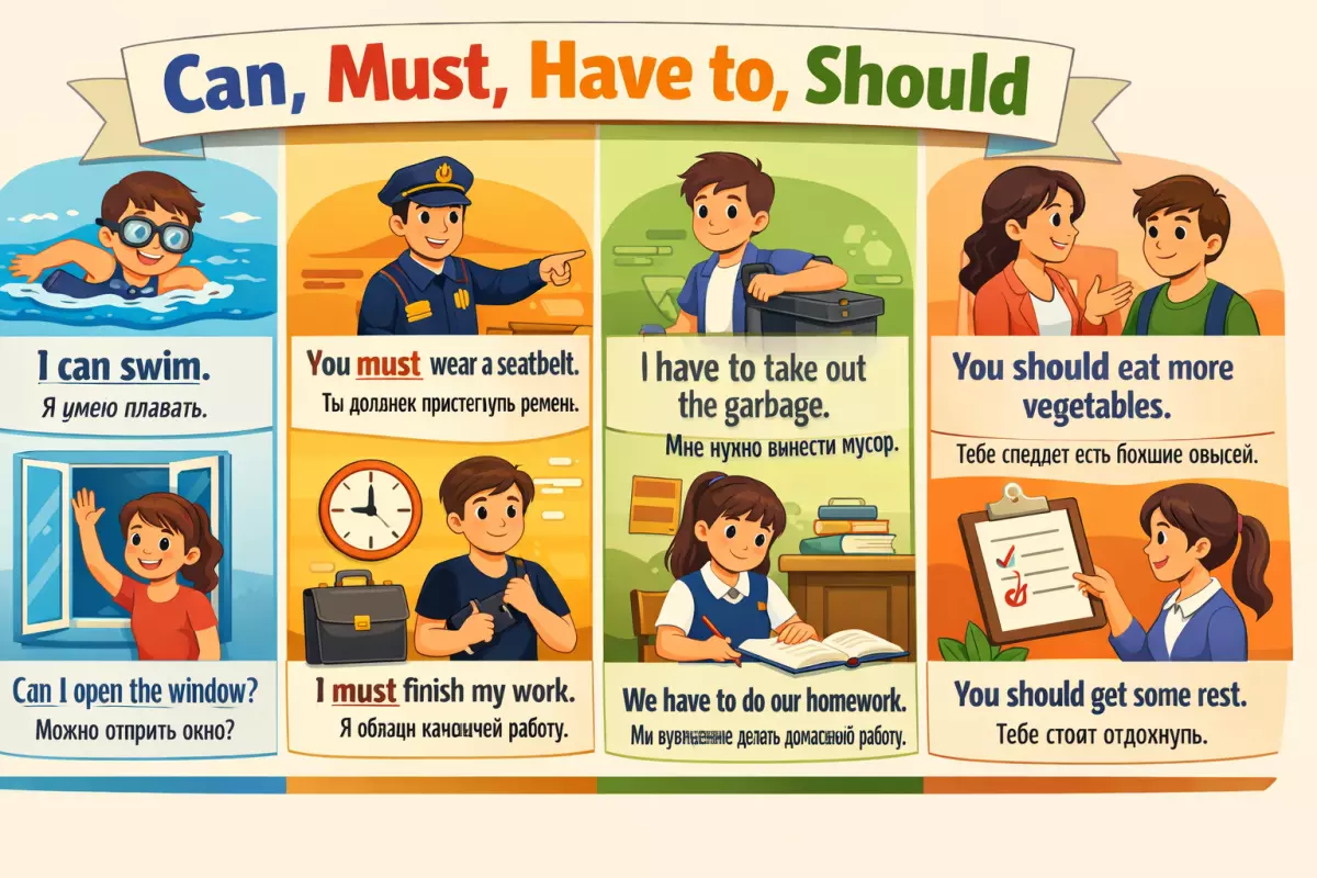 Для уровней A1–A2 обычно достаточно освоить несколько самых частых форм и научиться использовать их в коротких повседневных предложениях. Это база для разговоров о школе, работе, доме, здоровье, планах и правилах. Если ученик понимает разницу между can и must, между have to и should, ему уже намного легче строить живую речь.