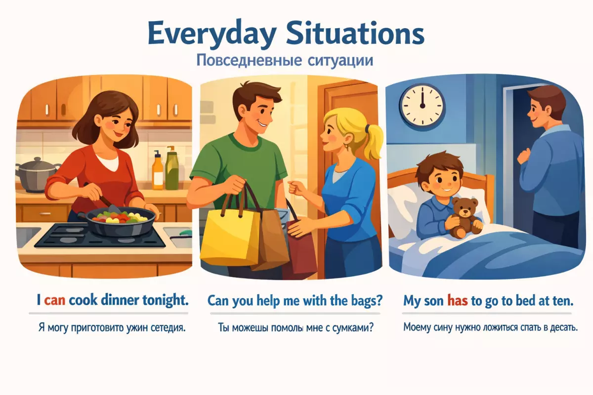 Модальные глаголы лучше всего запоминаются не в изоляции, а в обычных жизненных сценах. Когда фраза связана с домом, транспортом, работой или здоровьем, значение становится понятнее без длинного объяснения. Ниже — типичные ситуации, где эти формы действительно нужны каждый день.