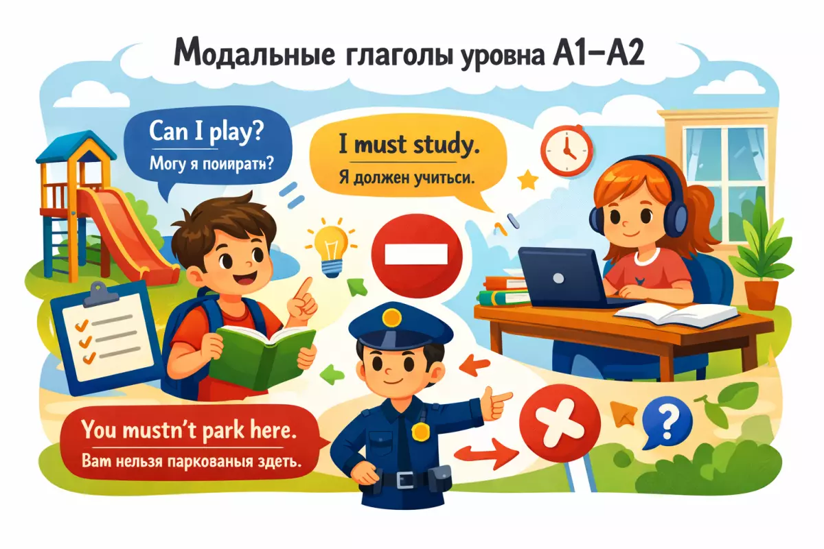 Модальные глаголы для уровней A1–A2 только сначала кажутся сложными, но именно они помогают быстро начать говорить о просьбах, возможностях, обязанностях и советах. В этом материале мы разберём их простыми словами, на понятных примерах и без лишней теории, чтобы вы могли легче запомнить основные конструкции и увереннее использовать их в речи уже с первых шагов изучения английского языка.