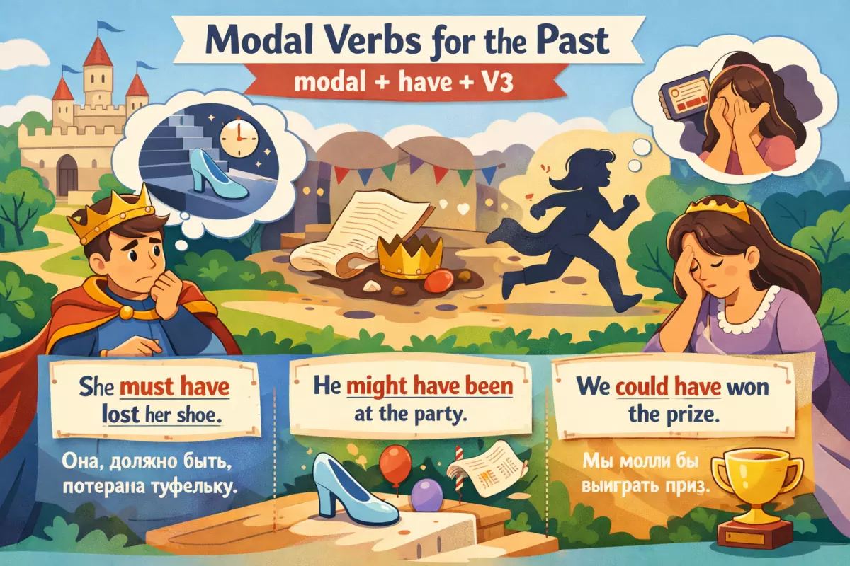 Одна из ключевых тем уровня B1–B2 — модальные конструкции для прошлого. Здесь уже недостаточно сказать просто must или should. Чтобы говорить о прошлых событиях, обычно используют схему modal + have + V3. Она помогает выразить догадку, сожаление, критику, упущенную возможность или вывод о том, что, вероятно, произошло раньше.