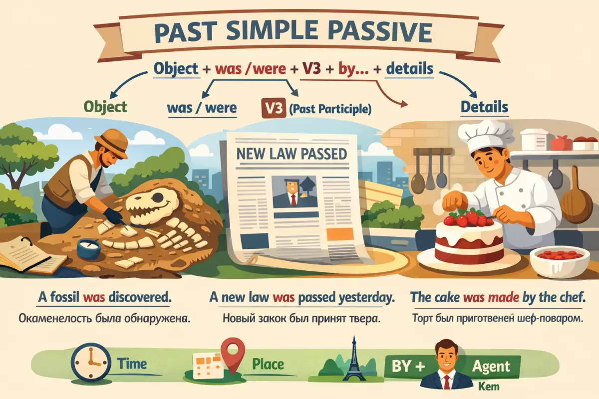 Чтобы не путаться, полезно разделять конструкцию на две части: вспомогательный глагол в прошедшем времени и причастие прошедшего времени. Именно их сочетание и создаёт пассив в Past Simple.