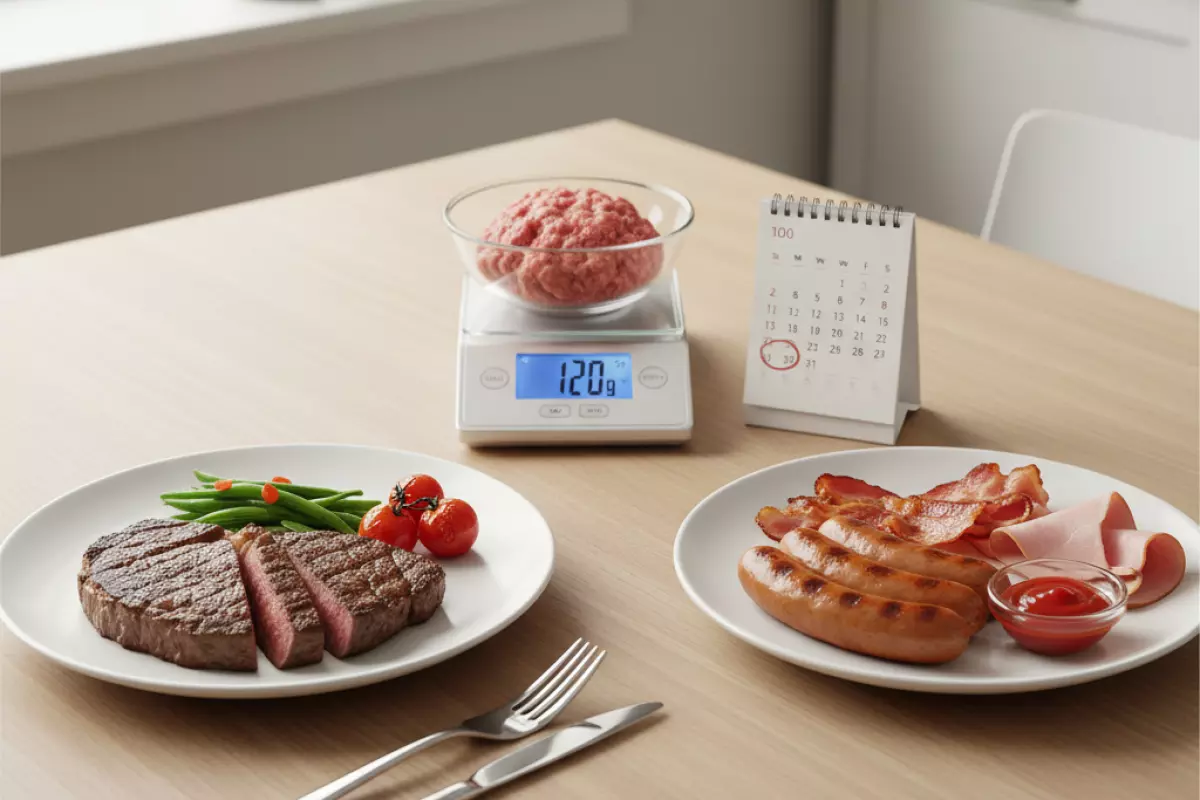 Ориентир по количеству проще всего держать через вес готового продукта и частоту в неделю. Для большинства взрослых адекватной отправной точкой считают 1–3 приёма в неделю по 80–120 г готового мяса за раз. Если в рационе и так много животных продуктов (колбасы, сосиски, полуфабрикаты, сыр), частоту лучше смещать к нижней границе.