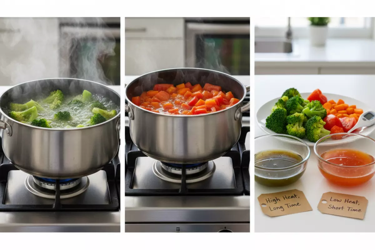 - Низкие и средние режимы (тушение, припускание) мягче для витаминов, но важна длительность: долгие 40–60 минут могут «съесть» эффект бережного огня.