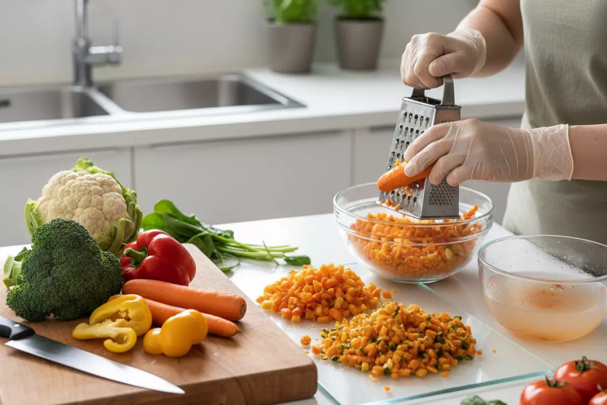 | Натирание на тёрке | Максимальное разрушение клеток, активное окисление | Готовить сразу, не хранить натёртое | Морковь, яблоко в салатах |