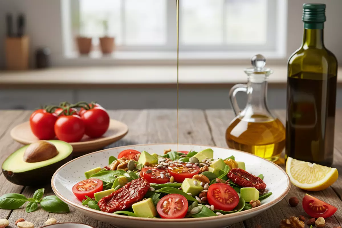 Для обычной порции салата или гарнира чаще всего хватает 1–2 чайных ложек масла на порцию или эквивалента из других продуктов. Если есть ограничения по калорийности, проще «встроить» жиры точечно: немного масла в заправку, пару ломтиков авокадо или горсть орехов — и этого достаточно.