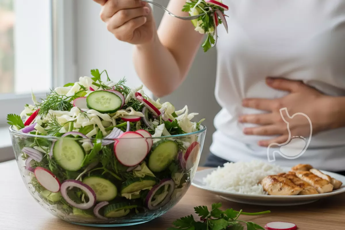 | Большой сырой салат на ужин | Огурцы + капуста + редис + лук, много зелени | Вздутие, урчание, дискомфорт ночью | Оставить 2–3 компонента, лук ошпарить, часть овощей заменить на запеченные |