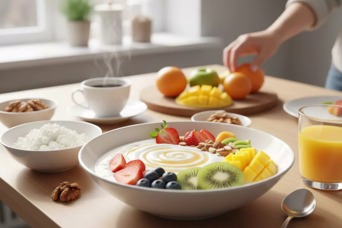 - В составе завтрака фрукты часто переносятся легче и дают более ровную сытость, особенно вместе с кашей, творогом, яйцами.