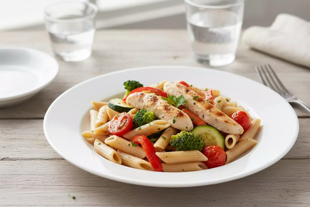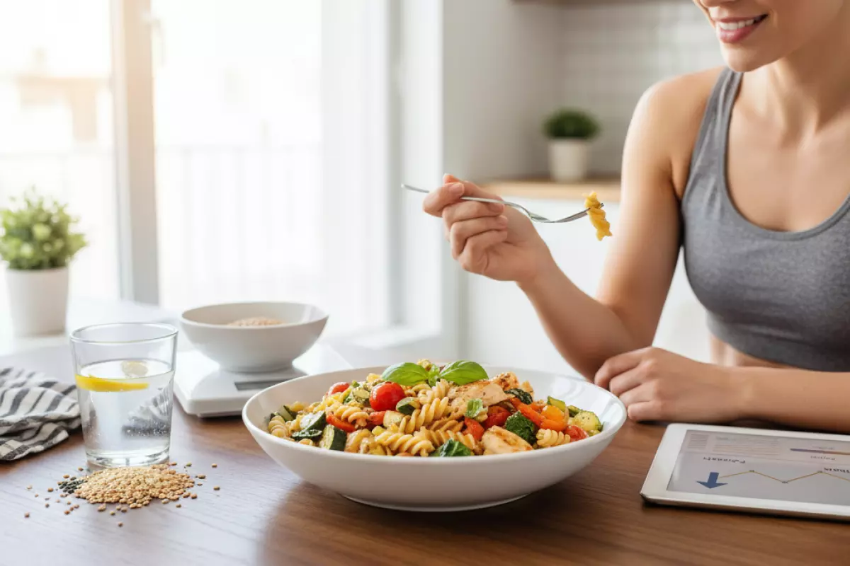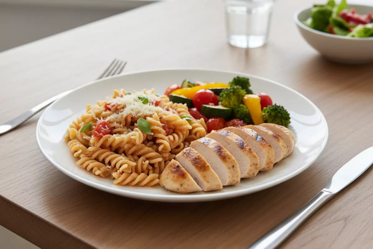 Чтобы тарелка получалась сытной, но без лишних калорий, важно не «дожимать» порцию соусом и сыром, а собрать блюдо из трёх опор: умеренная порция пасты, источник белка и объёмные овощи. Так проще держать аппетит под контролем и не добирать энергию перекусами через час.