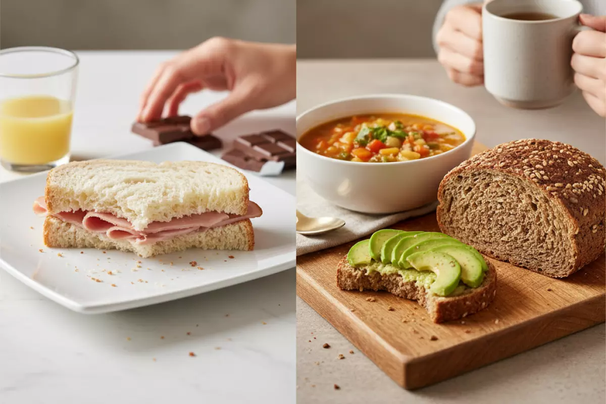 То, насколько быстро вы проголодаетесь после бутерброда или тарелки супа с ломтиком, чаще зависит не от самого факта «хлеб был», а от его состава и того, с чем вы его едите. Белая выпечка из муки высшего сорта обычно переваривается быстрее: сахар в крови подскакивает, а затем так же быстро снижается — и рука снова тянется к перекусу. Цельнозерновые варианты, наоборот, чаще дают более ровное чувство сытости за счёт клетчатки и более «медленных» углеводов.