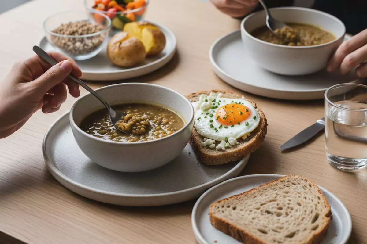 | Суп и ломтик | Ржаной или цельнозерновой | Овощной суп, чечевичный суп, борщ | Тёплая еда + немного хлеба хорошо насыщают | Если суп с картофелем/лапшой, ломтик можно уменьшить |