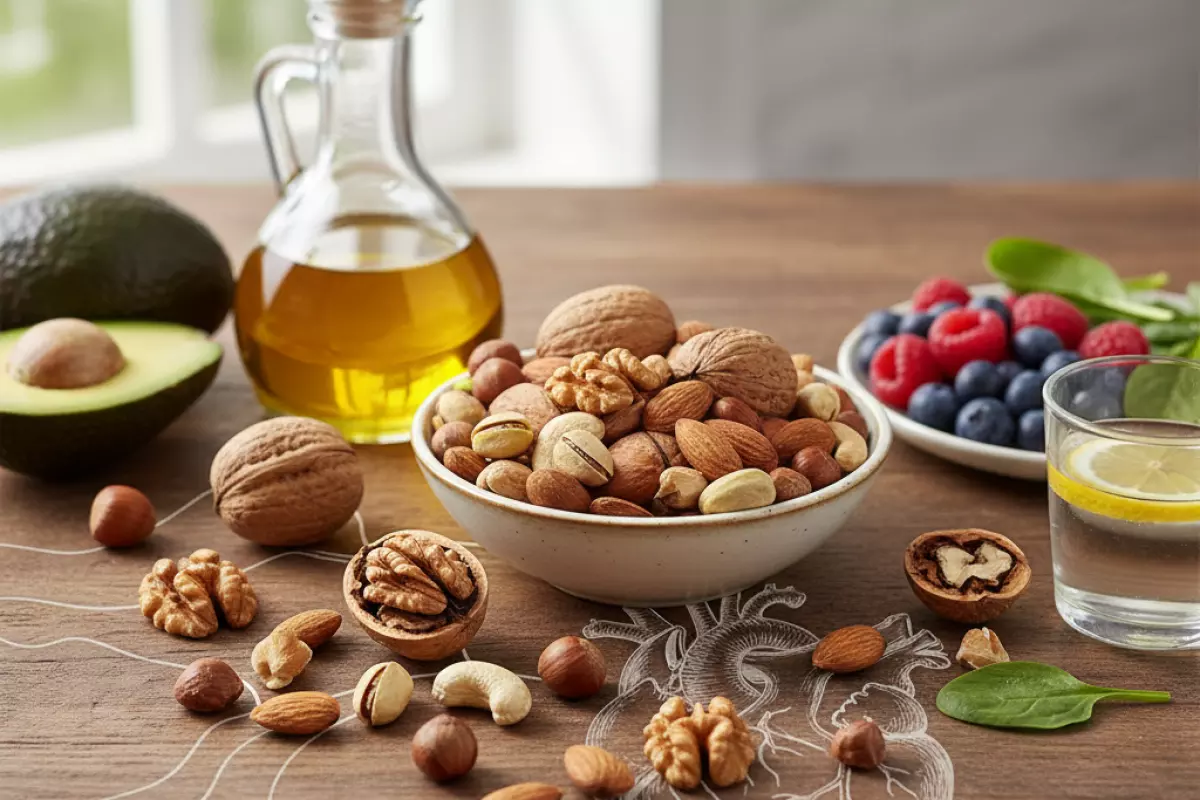 - Антиоксиданты — например, витамин E в миндале и фундуке, полифенолы в грецких.