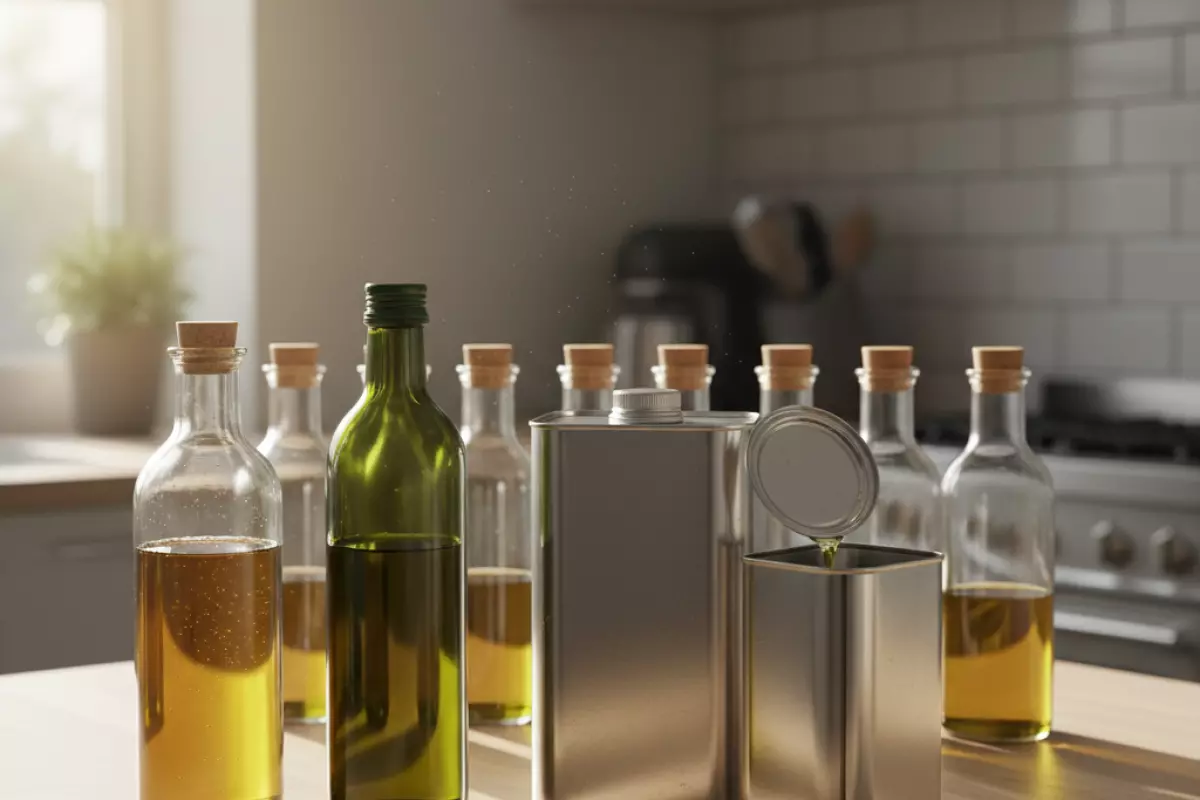 | ПЭТ-пластик (прозрачный) | Низкая | Средняя: материал более «проницаем», чем стекло | Средняя | Свет + тепло, хранение рядом с плитой | Если масло будет использовано быстро |