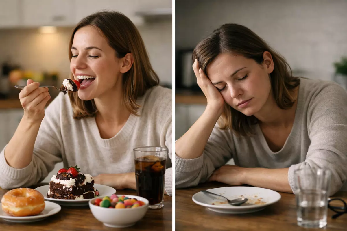 Из-за этого формируется замкнутый круг: сладкое даёт быстрый комфорт, но затем провоцирует новый голод. Если это повторяется ежедневно, человеку становится сложнее контролировать аппетит и размер порций.