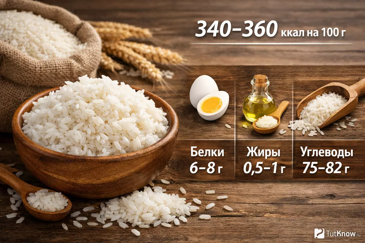 Калорийность коричневого (бурого) варианта на 100 г сухого продукта обычно находится в диапазоне 330–370 ккал. После варки энергетическая ценность снижается за счёт воды и в среднем составляет 110–130 ккал на 100 г готового блюда, в зависимости от степени разваривания.