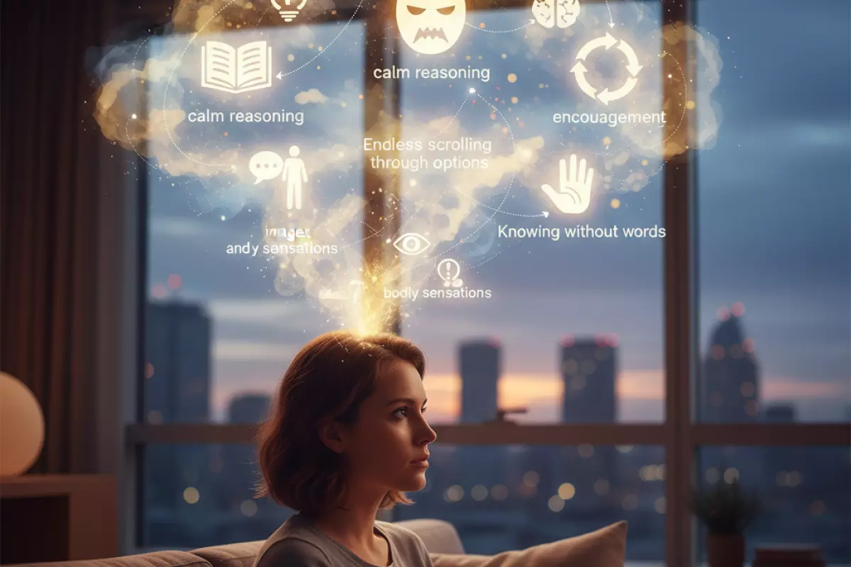По форме он бывает разным: у кого-то это слова и фразы, у кого-то — образы, телесные ощущения и «знание без слов». Но в любом случае мозг собирает опыт в быстрые выводы, чтобы экономить силы: «опасно/безопасно», «я справлюсь/не справлюсь», «меня примут/меня осудят».