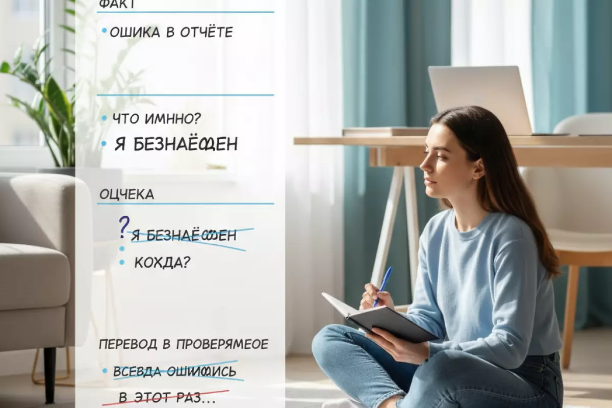| «Я всё испортил» | Стыд, ощущение «я плохой», желание спрятаться | «Я допустил ошибку, это поправимо» | Назвать 1 конкретную ошибку и 1 конкретное исправление |